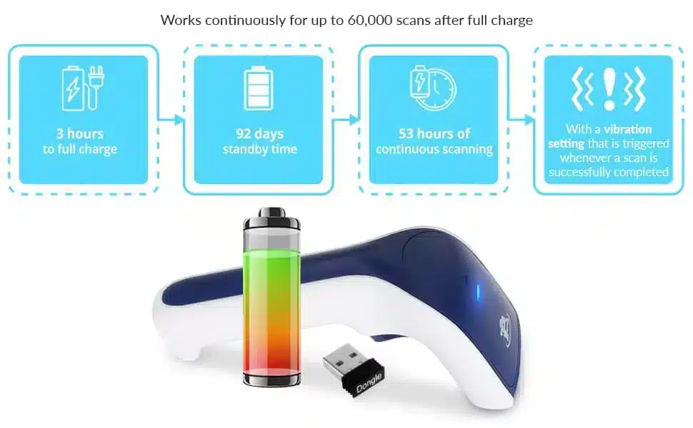 This is the best scanner I’ve ever had! I’ve owned it for a couple years and it still works great. I’ve dropped it multiple times and it keeps on ticking. Depending on how much you use it, it will hold its charge for almost a week. It scans those hard to read barcodes that my other scan can’t read. Love it!